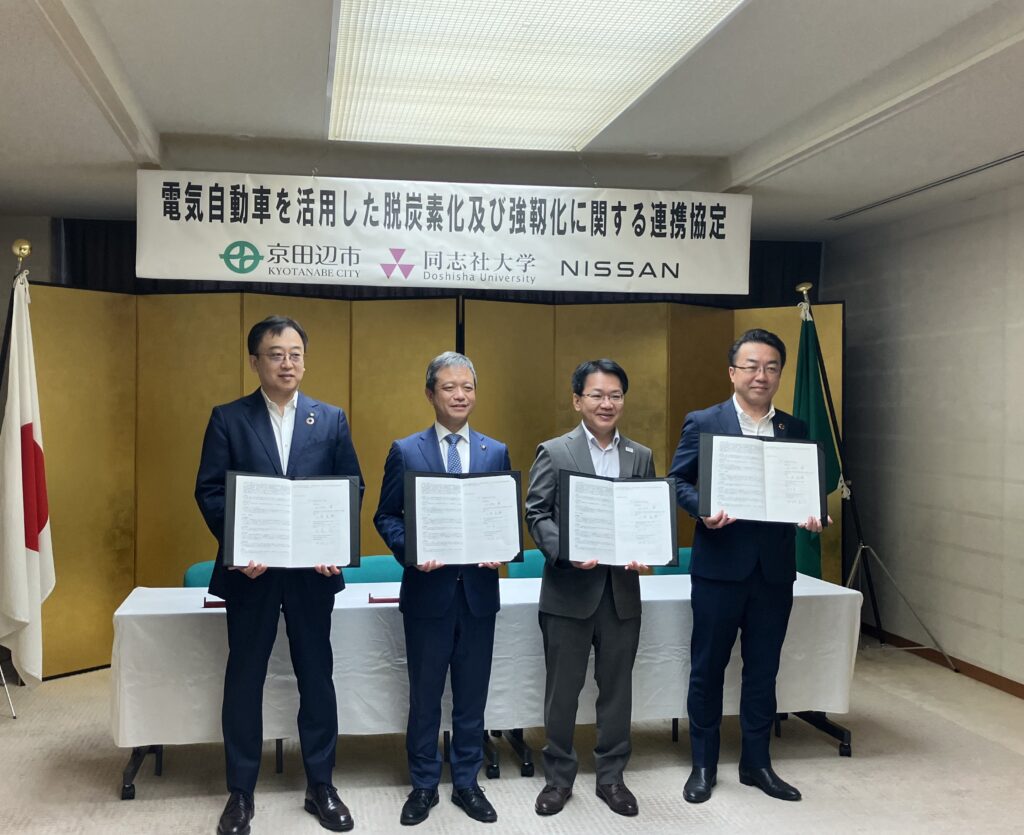 京都府京田辺市、同志社大学、日産自動車株式会社、および京都日産自動車株式会社の4者は、2025年10月3日、電気自動車(EV)の普及を通じ、京田辺市内の脱炭素化と強靭化を図ることを目的とした連携協定を締結しました。本レポートでは締結式や終了後に行われたデモンストレーションの様子をご紹介いたします。