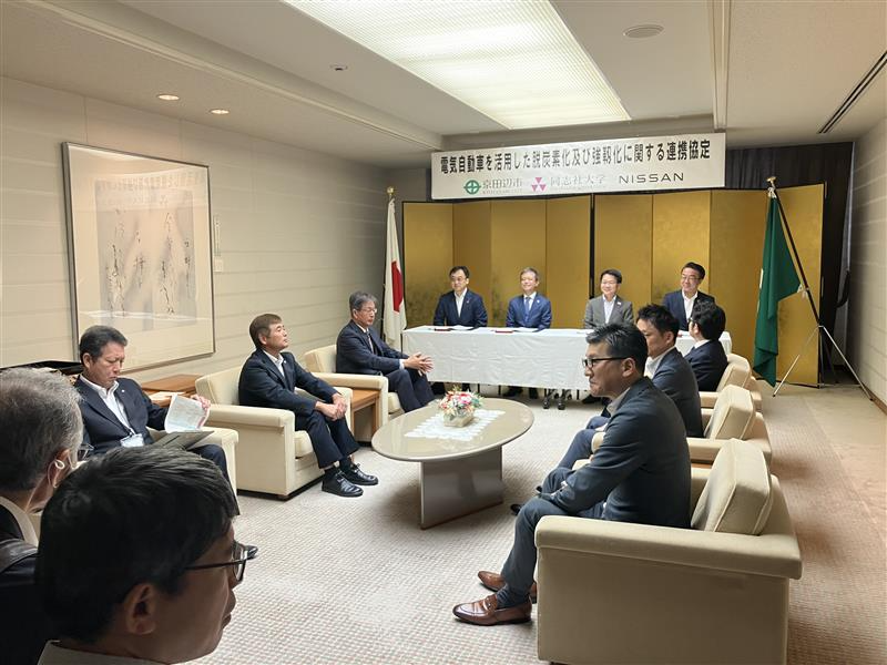 同志社大学は、2024年7月に京田辺市・日産自動車と持続可能なまちづくりに向けEVを活用したゼロカーボンシティ実現とモビリティサービスの推進に向けた産官学連携協定を締結。この度、脱炭素化の促進と強靭化を目指す京田辺市と、ゼロカーボンを推進する同志社大学が日産の「ブルースイッチ」に賛同し、本協定を結ぶ運びとなりました。