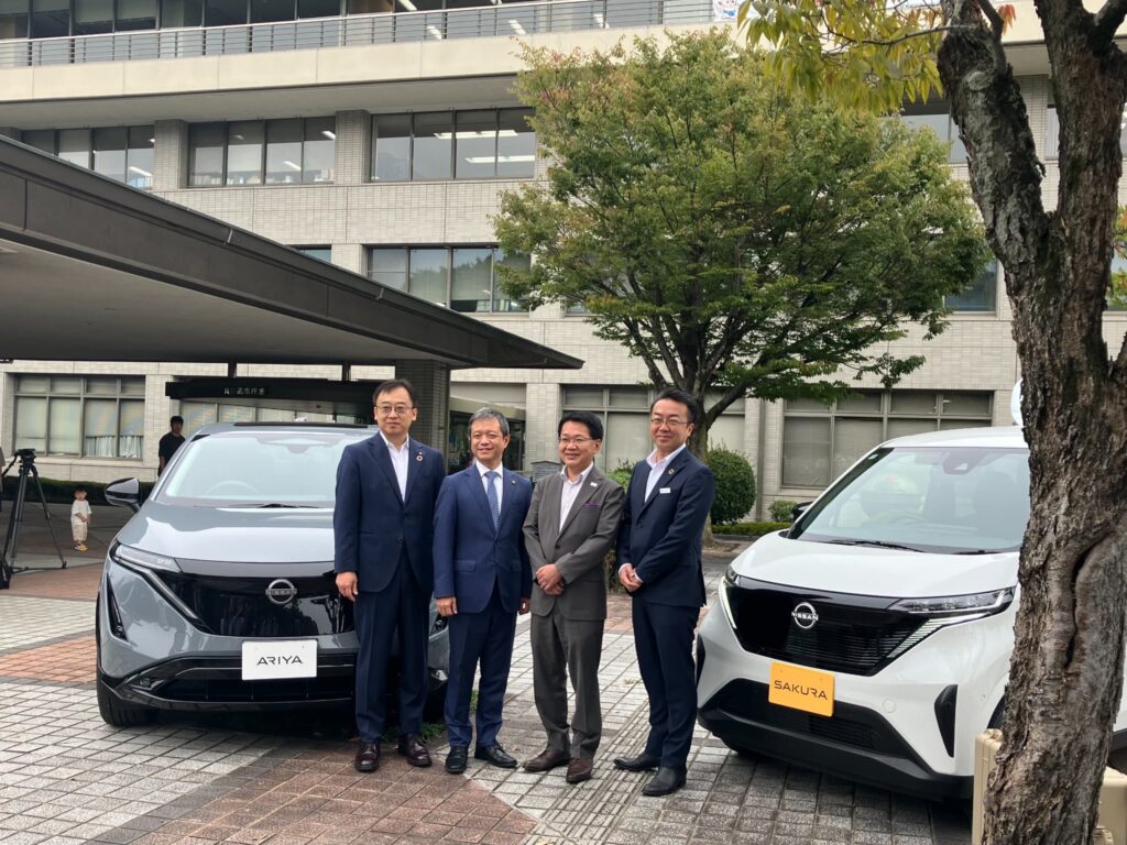 締結式終了後は京田辺市役所の玄関前に場所を移動し、給電デモンストレーションとフォトセッションが行われました。玄関前には日産の電気自動車である日産アリア、日産サクラが並びました。