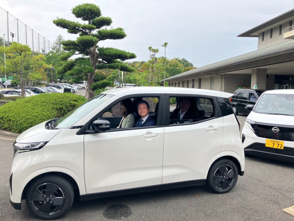 京都日産のブランドクルーによる試乗体験も行われ、実際に日産サクラの走りを体感した上村市長は、「ストレスなく加速、侵入、車線変更が行えるのは電気自動車ならではの特性で、エンジンタイプと違ってラグがない」と感激されていました。
